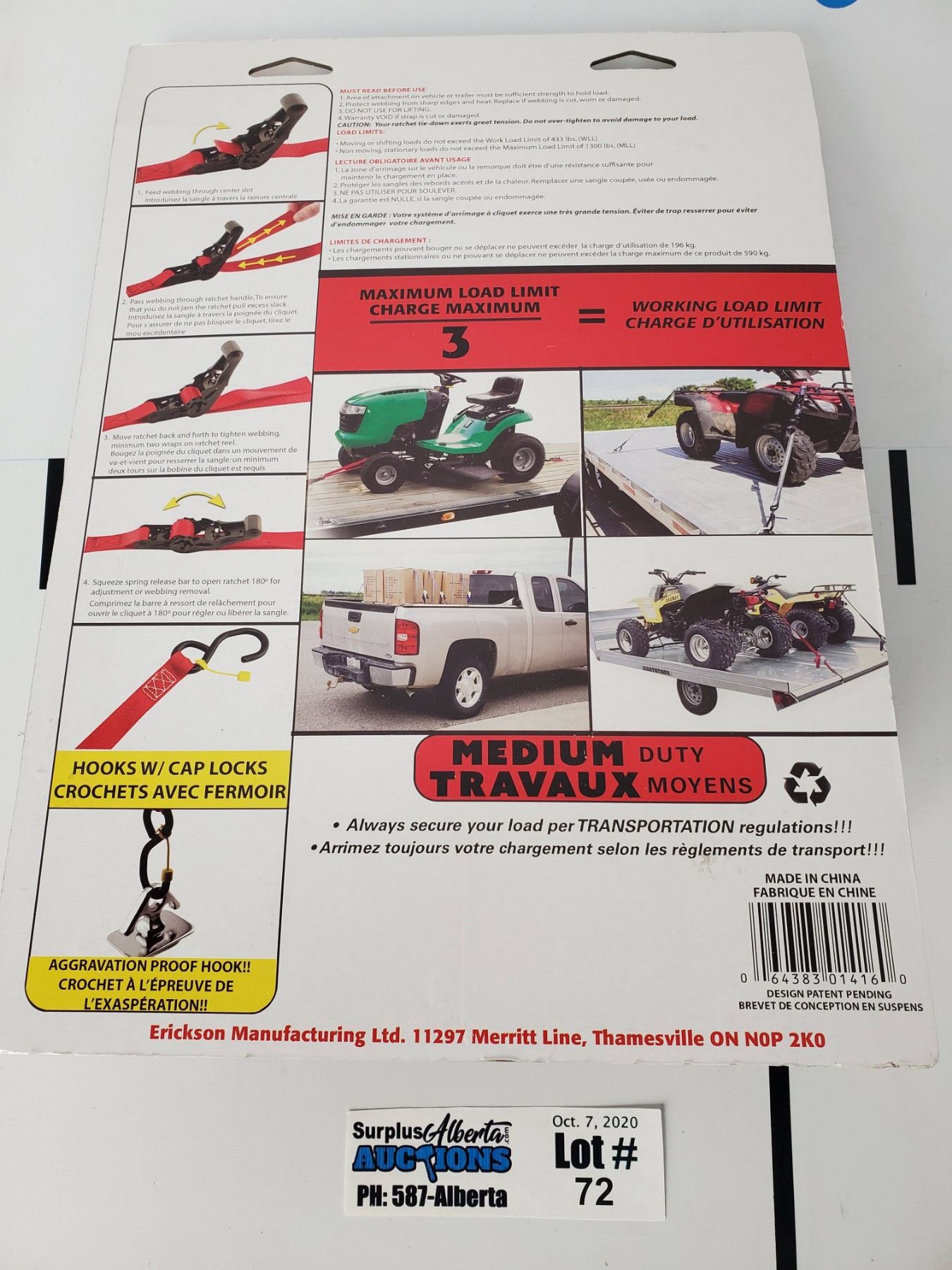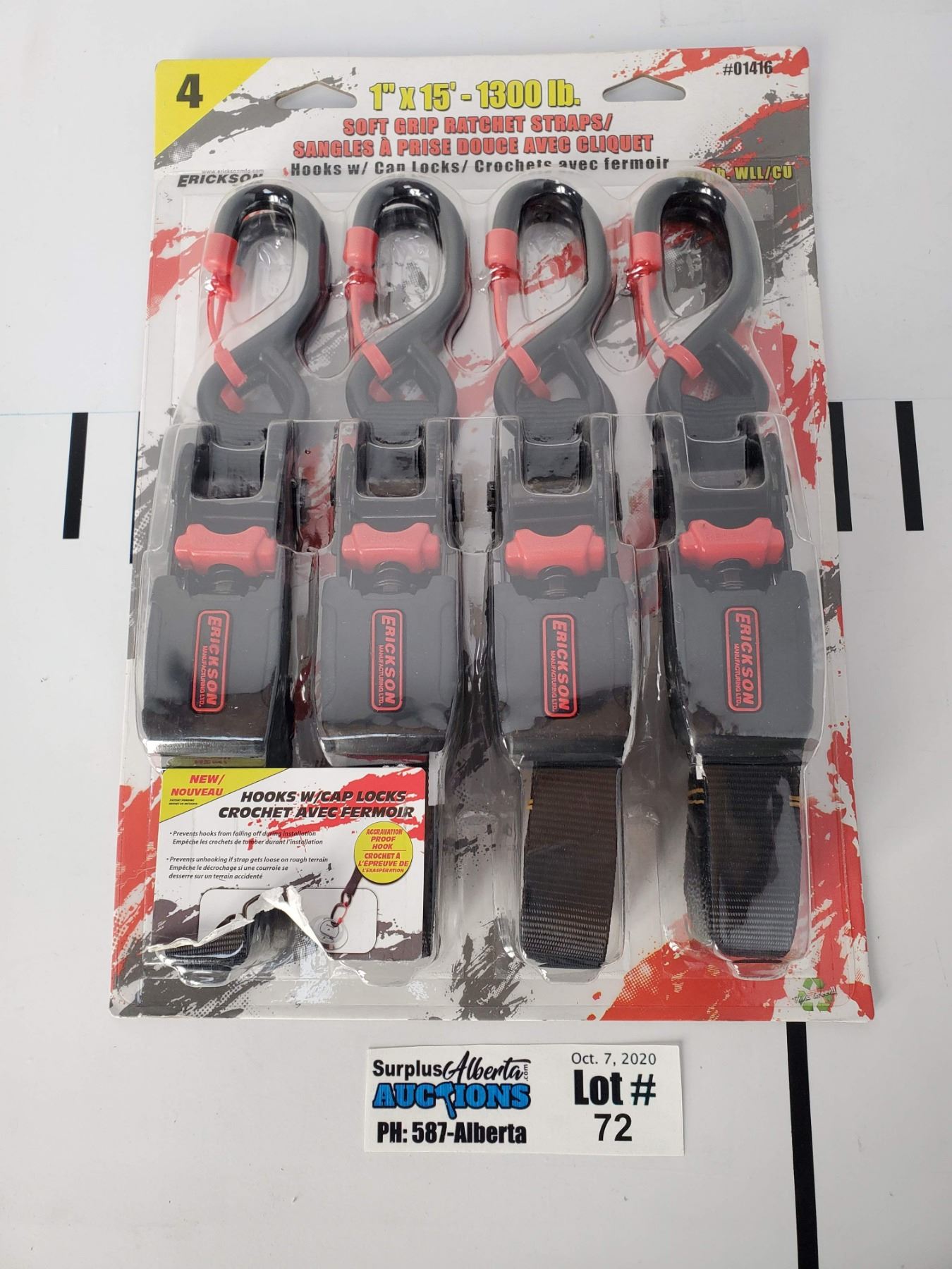 4 Pack of Erickson Manufacturing 1" x 15' 1300lb Soft Grip Rachet Straps - Unopened