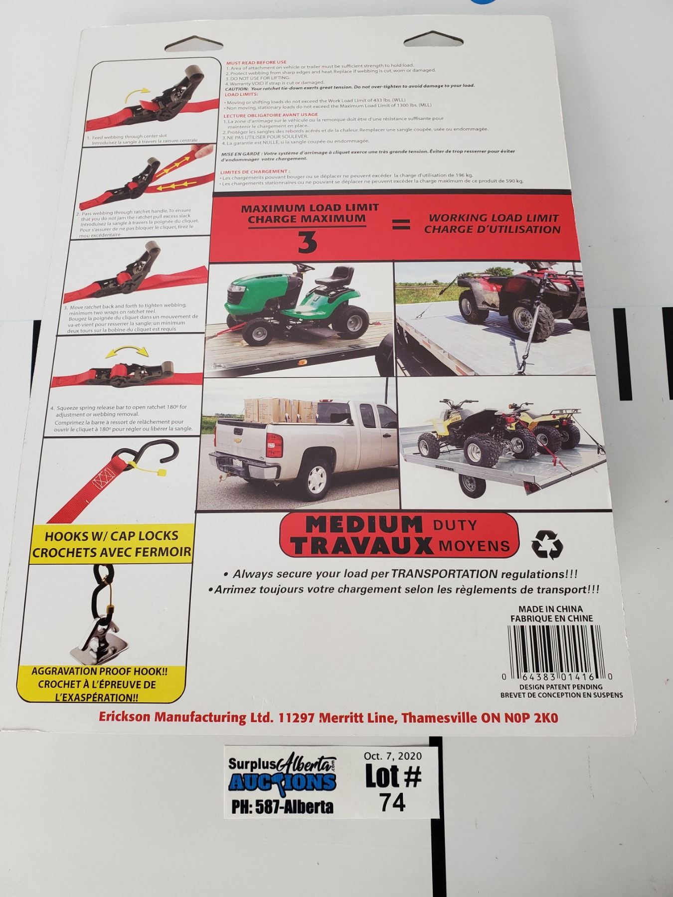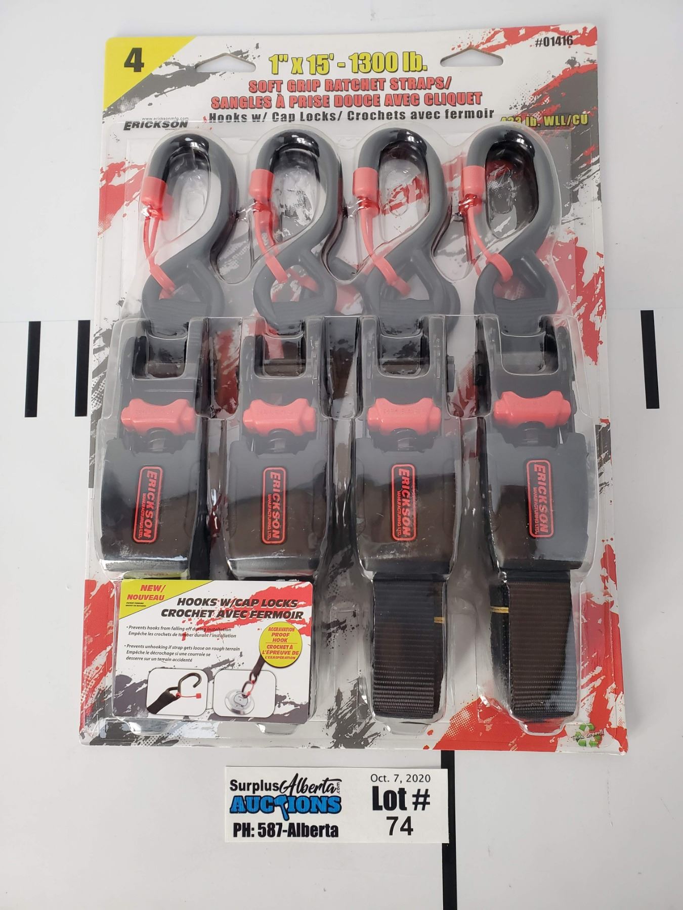 4 Pack of Erickson Manufacturing 1" x 15' 1300lb Soft Grip Rachet Straps - Unopened