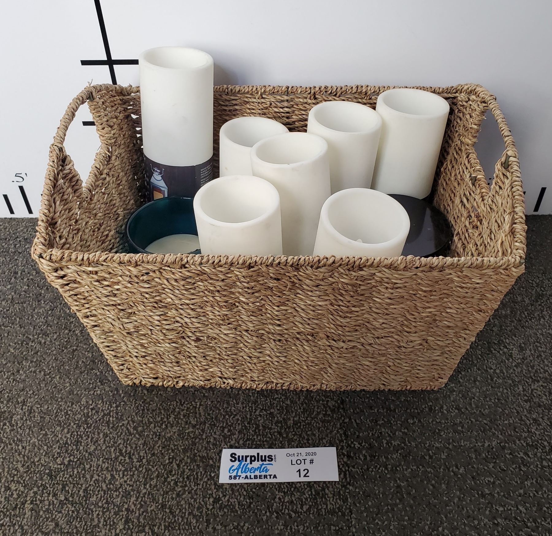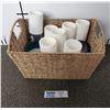 Lot of Battery Powered Candles and some Used Real Candles in a Wicker Basket.