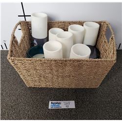 Lot of Battery Powered Candles and some Used Real Candles in a Wicker Basket.12 - Lot of Battery Powered Candles and some Used Real Candles in a Wicker Basket.